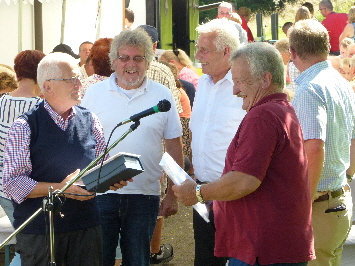 Um kurz nach 11 Uhr eröffnete der Männergesangsverein Oberheuslingen (MGV) gesanglich die Veranstaltung. Werner Schreiber unser 1. Vorsitzender, begrüsste unsere Gäste ganz herzlich, bevor unser werter Herr Bürgermeister Eckhard Günther seine Grußworte sprach. Er machte klar, dass Heimatvereine generell Tätigkeitsbereiche der Stadt übernehmen würden, die aufgrund fehlender Kapazitäten nicht geleistet werden können und bedankte sich bei uns für unser herausragendes Engagement. Es folgte die beeindruckende Chronik unseres Vereins, vorgetragen durch unseren Pressechef Karl- Friedrich Loos. Heute ist die Heimatpflege, Geselligkeit und die Aufrechterhaltung der Seejerlänner Mundart ein wichtiger Aspekt des Vereins, Es folgte Herr Dieter Tröps, Vorsitzender des Heimatbundes, der unseren Verein insbesondere für seine Fortschrittlichkeit lobte, denn der Fortbestand diverser Heimatvereine könne nur durch das Zusammenlegen mehrere Ortschaften gesichert werden, was bei uns ja schon seit Jahren so praktiziert würde. Höhepunkt war die Ehrung der 22 Gründungsmitglieder aus 1975, die jeweils eine Urkunde sowie einen Glasständer mit Gravur erhielten. Unser Werner Schreiber, der Damit war der offizielle Teil der Veranstaltung beendet und der gesellige Teil des Nachmittags konnte beginnen. Ganz herzlich möchten wir uns bei unseren Freunden des Heimatvereins Oberfischbach bedanken, die uns und unsere Gäste mit leckerer Currywurst/ Pommes etc versorgten und dem MGV, die uns gesanglich Freude bereiteten sowie leckere Erbsensuppe bescherten. Ein dickes Dankeschön an die Damen, die die Kinderbelustigung übernommen haben und an die Männer an den Holz befeuerten Waffeleisen, die im wahrsten Sinne des Wortes “im Schweiße Ihres Angesichtes” uns leckere Waffeln gebacken haben. Auch möchten wir uns ganz herzlich bei den Vorstandsmitgliedern, für die Planung des Festes, allen Mitgliedern, den Spendern der leckeren Torten und Kuchen, sowie allen fleißigen Helfern bedanken. Ohne Euch wären wir nicht so ein toller Verein und könnten nicht so viel bewegen! >>> Hier gibt es noch mehr Bilder!